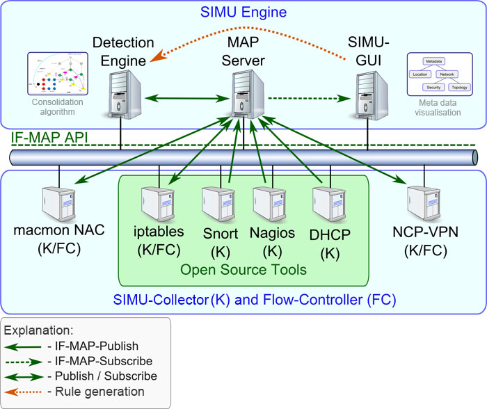- SIMU collectors and flow controllers: SIMU collectors collect information about end devices and processes within the network and publish these on the MAP-Server. SIMU flow controllers obtain information from the MAP-Server in order to consequently apply security measures automatically if necessary, e.g. set filter rules in order to prevent attacker’s access to intern systems. Individual devices can act either as collector or as flow controller. The producers NCP and macmon will extend their products in a way that these act as SIMU collectors and/or flow controllers. DECOIT will extend several open-source tools (Snort, Nagios etc.) by adding the SIMU capability.